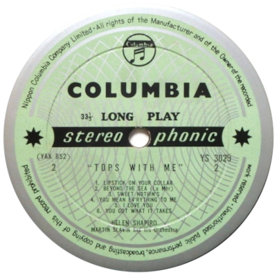 YAX852-J Side 2: 1.Lipstick on your collar 2.Beyond the sea (La mer) 3.Sweet nothin's 4.You mean ev'rything to me 5.I love you 6.You got what it takes